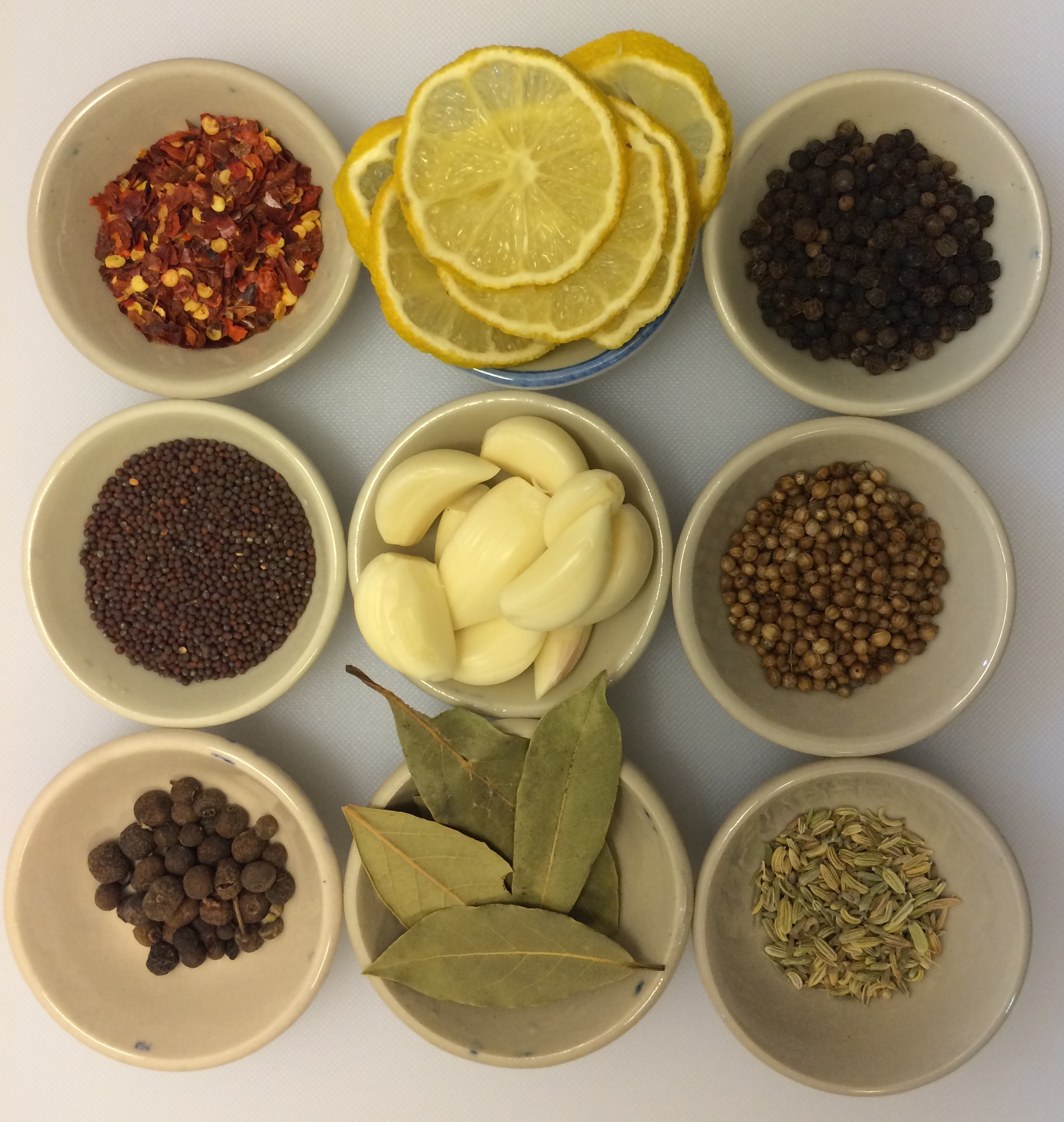The Spices. Clockwise from top left: black pepper, salt, hot sauce, Spanish paprika, dark brown sugar, ground garlic, ground onion, paprika, cayenne