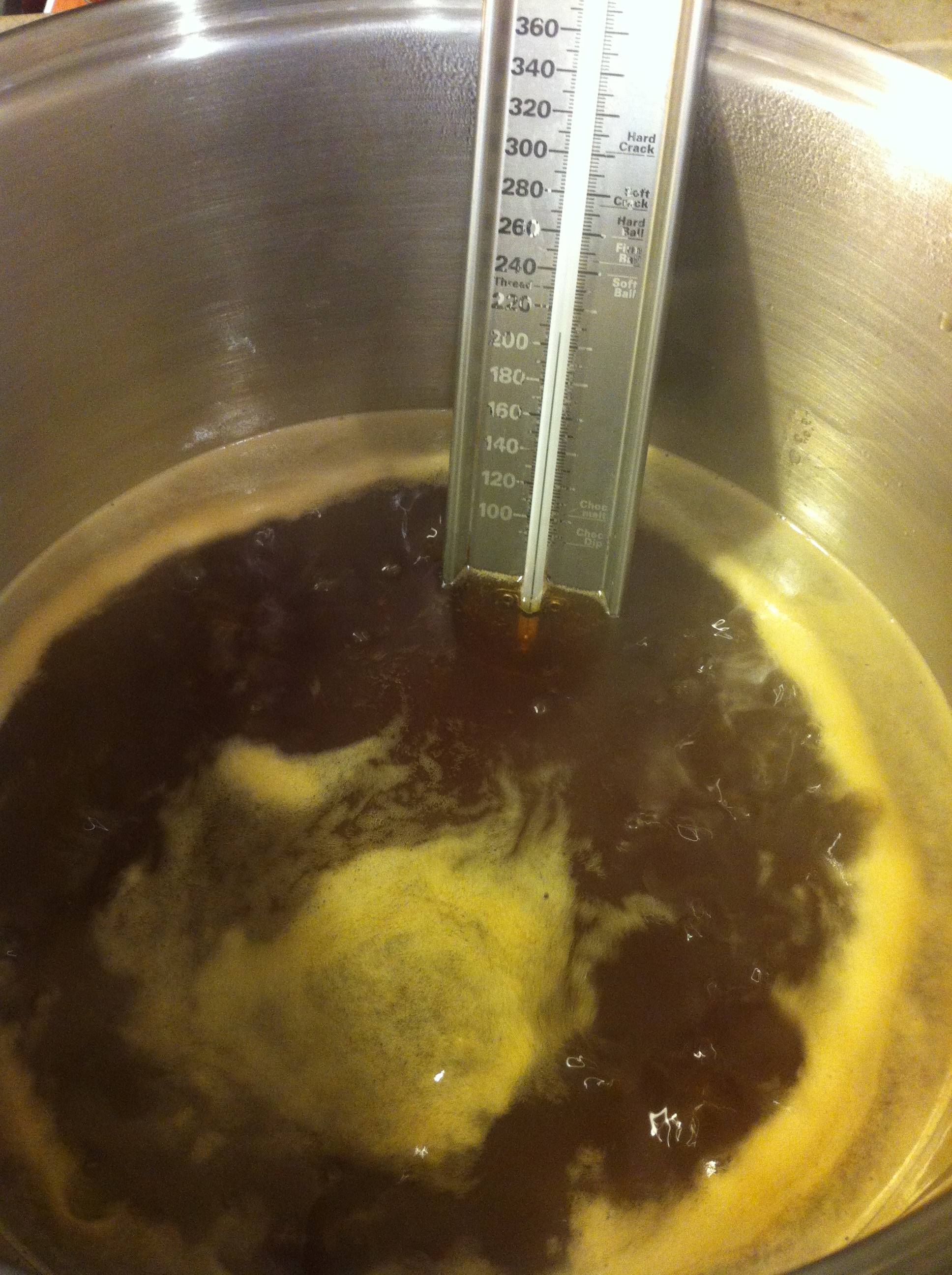 4.  In a large stockpot (I like to use my pasta pot), combine the pectin, reduced cider, honey, and lemon juice.  Attach a candy thermometer to the side of the pot or have one handy.  Bring the liquid to a boil over medium-high heat.  Lower the heat to medium-low and slowly cook the jelly until the mixture reaches 220F. (220F is the optimum temperature for gelling.)