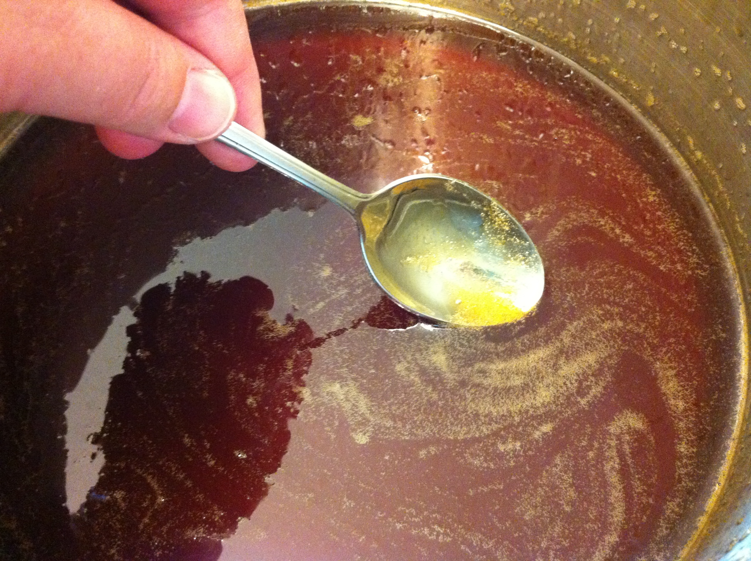 5.  Once the jelly is done, remove the stockpot from the heat.  With a large spoon, skim off as much foam as you can.