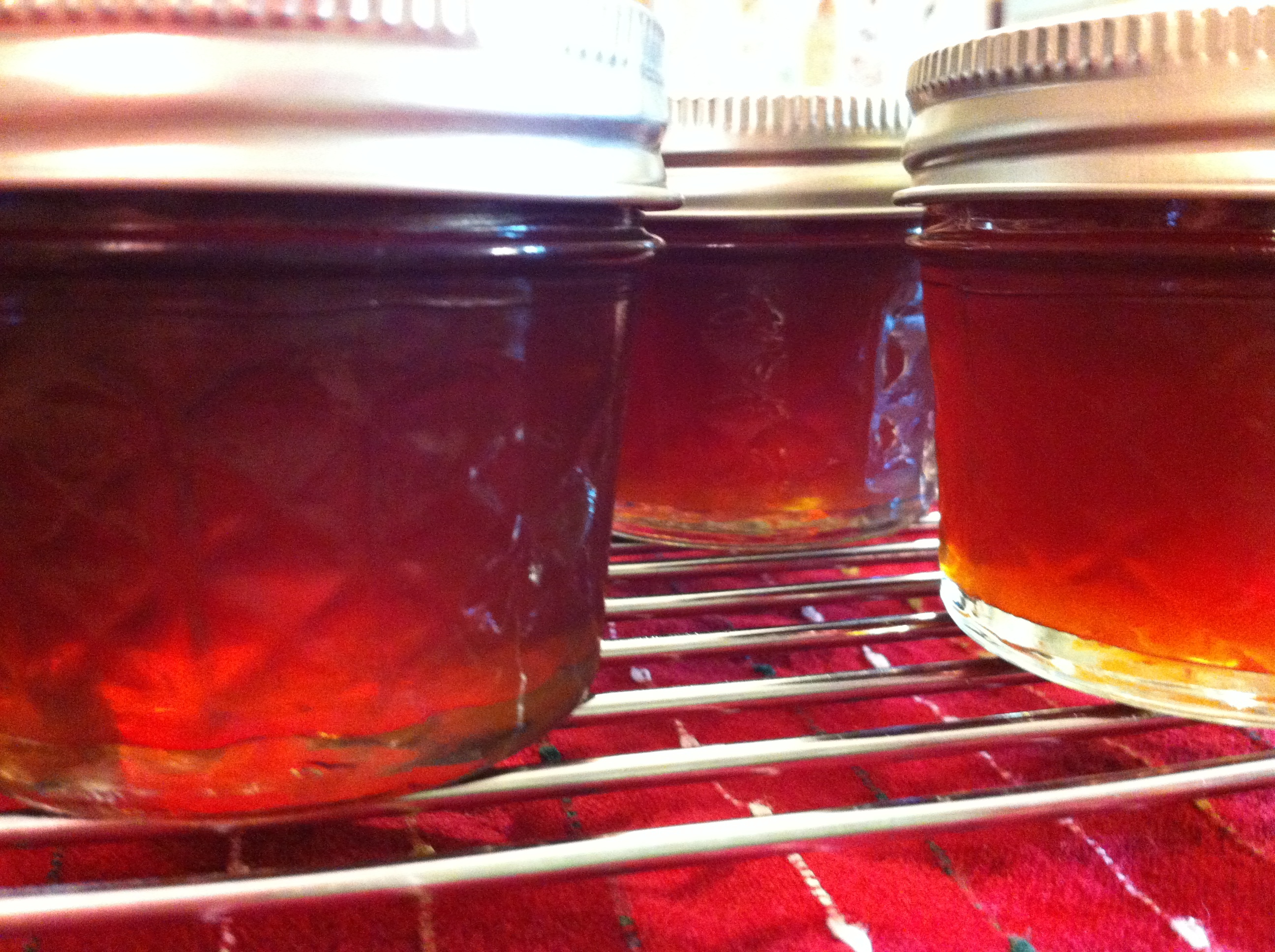 6.  Ladle the jelly into sterilized jars, leaving 1/4″ head space.  Process for 10 minutes (begin timing after the water comes to a boil).