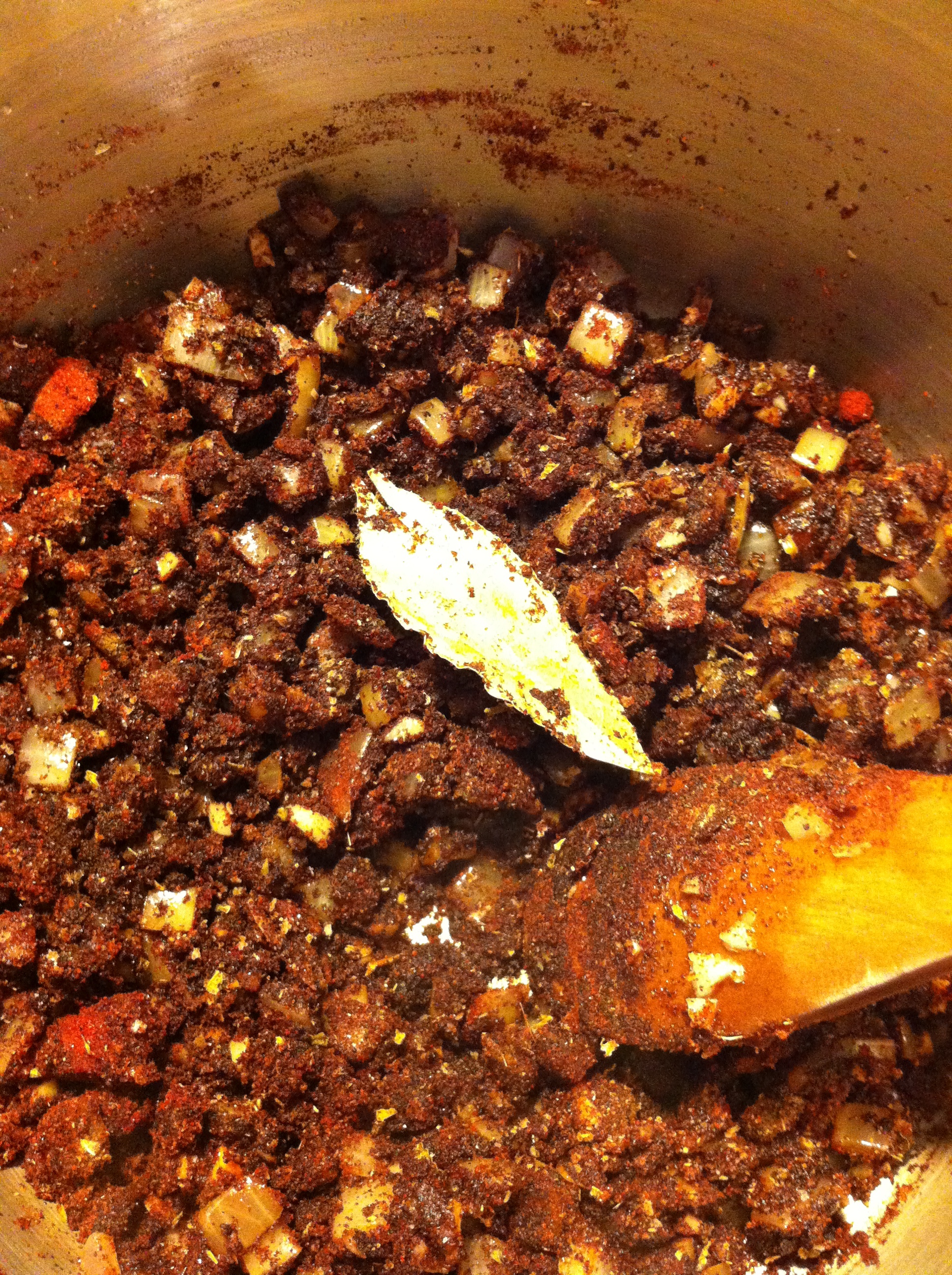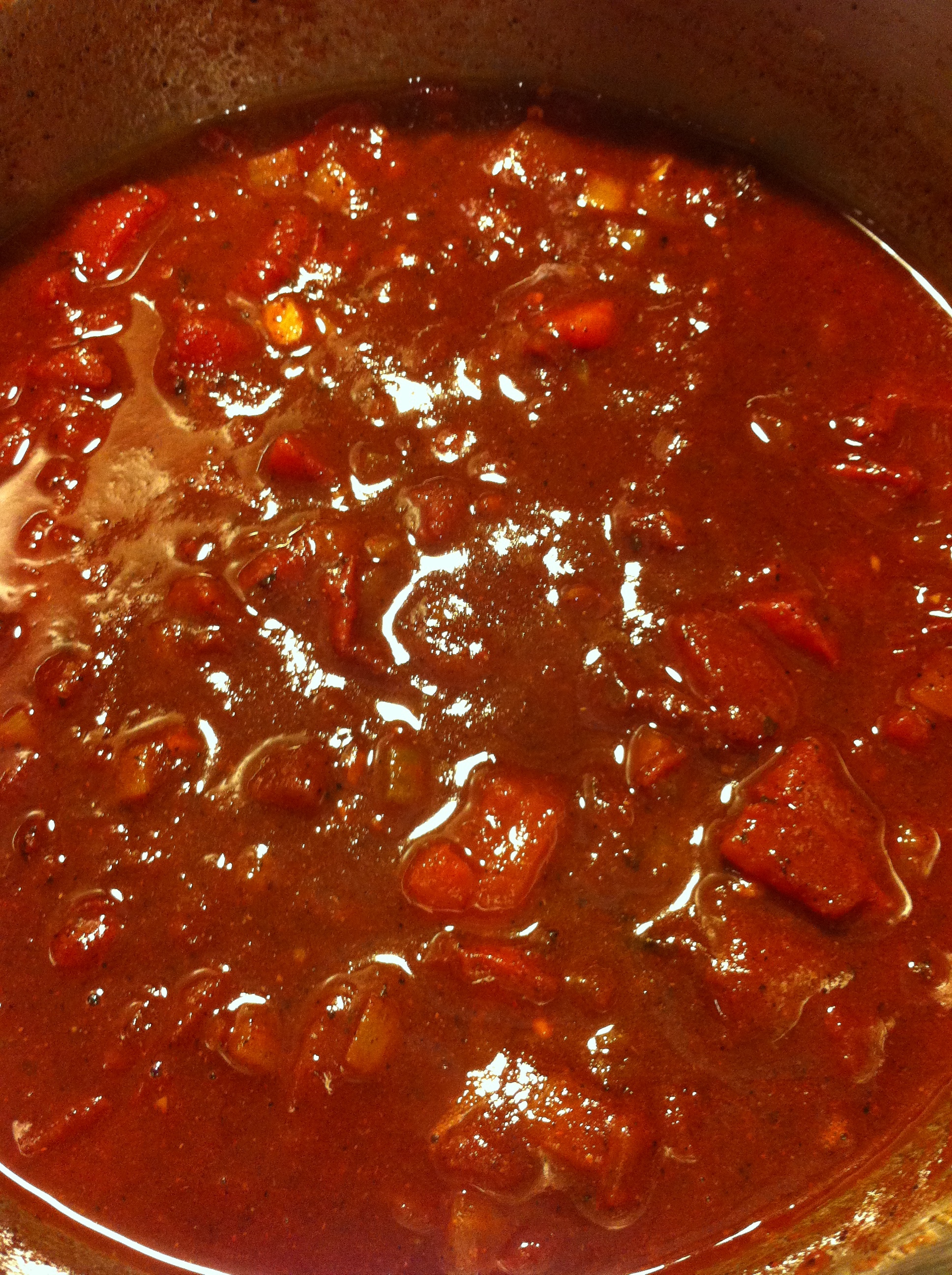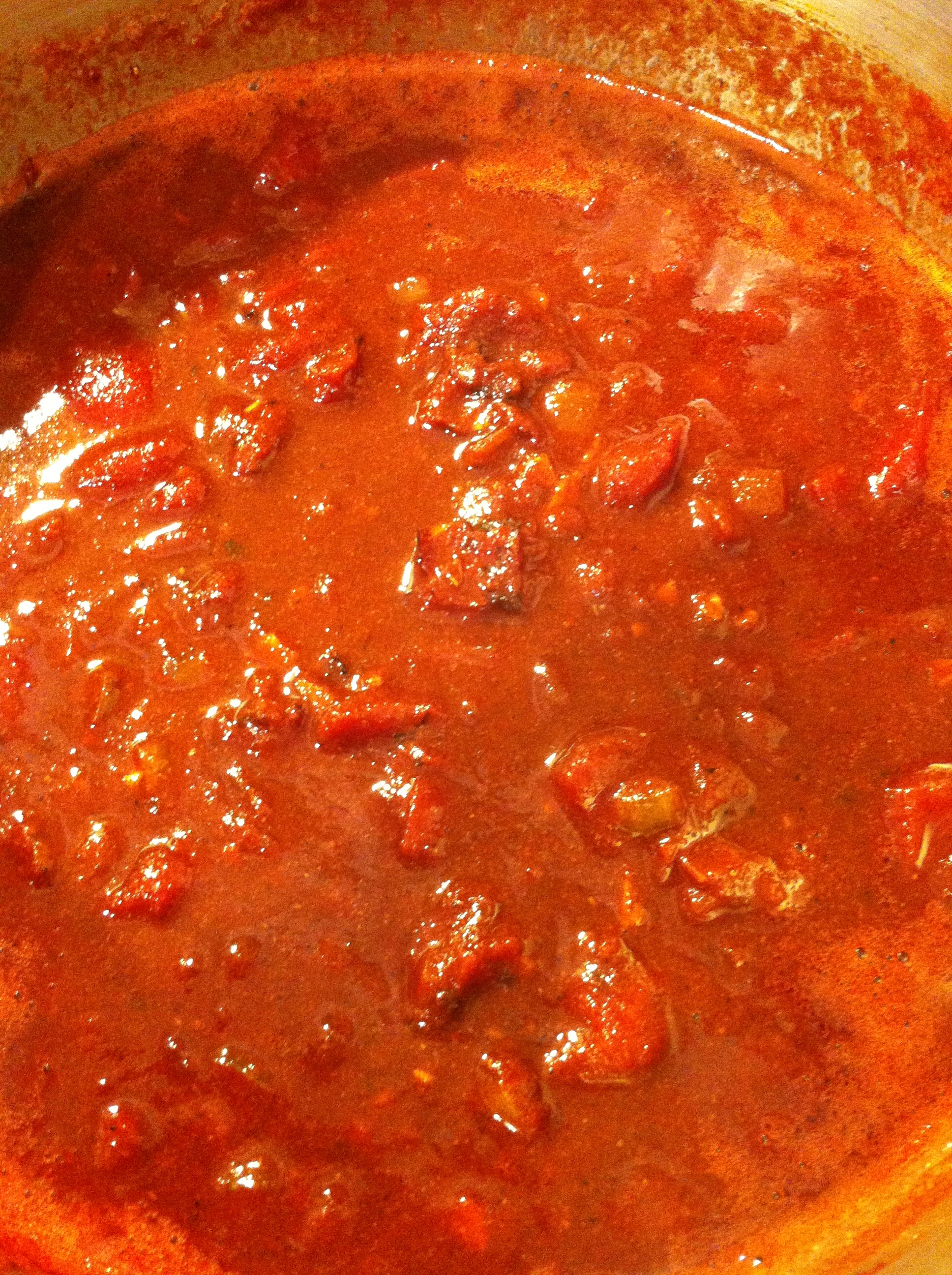 2. While the ingredients cook, you can mash them a bit if you like. Just cook until the tomatoes have completely broken down, about 30 minutes.
