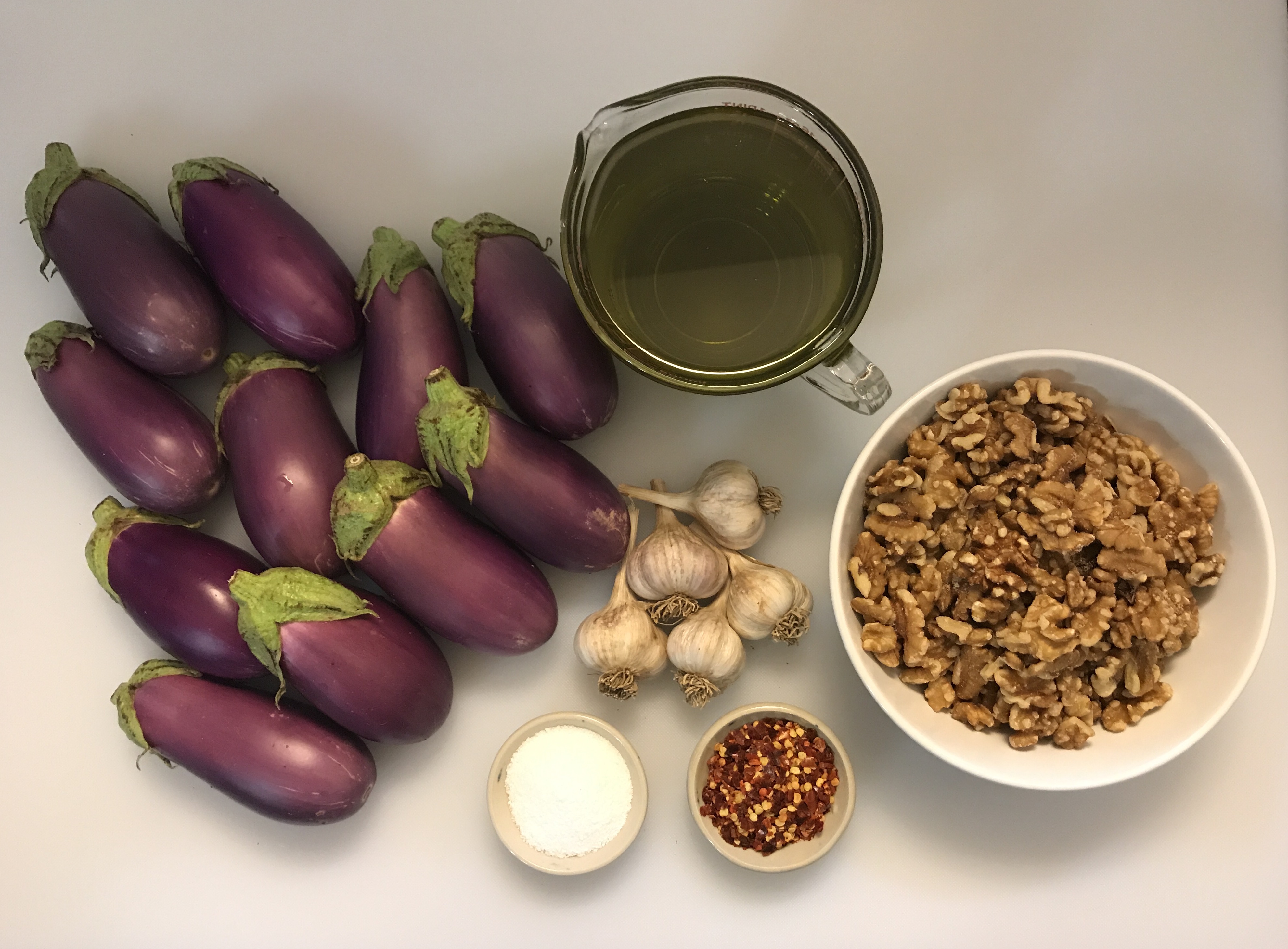 There are several ways Makdous can be prepared. One constant is the eggplant should be blanched and drained before stuffing. Some drain the eggplant by stuffing it first, placing it in the jar, then turning the jar over to let the liquid drain out; others will cut a slit in the eggplant, lay it slit side down, then let it drain overnight. I use the latter method. (There is only one time I’ve seen a recipe that simply salted the eggplant and let it drain without cooking.) Always use small or baby eggplant. The baby eggplant will be more tender, sweeter, and less apt to be bitter. You’ll be able to find baby eggplant in abundance in any grocery that caters to the Middle Eastern community or, if you’re lucky, at the local farmers market or farm stand during the growing season. (In central Texas, we have eggplant from roughly June through the first frost in late October/early November.) There are also, of course, ingredient variations. Some will use pepper paste (like harissa), a combination of sweet & hot peppers, cayenne, parsley, lemon, chili powder, Feta cheese (although they don’t last as long), cilantro (coriander), pecans, and pomegranate seeds. The constants are always eggplant, walnuts, and salt.