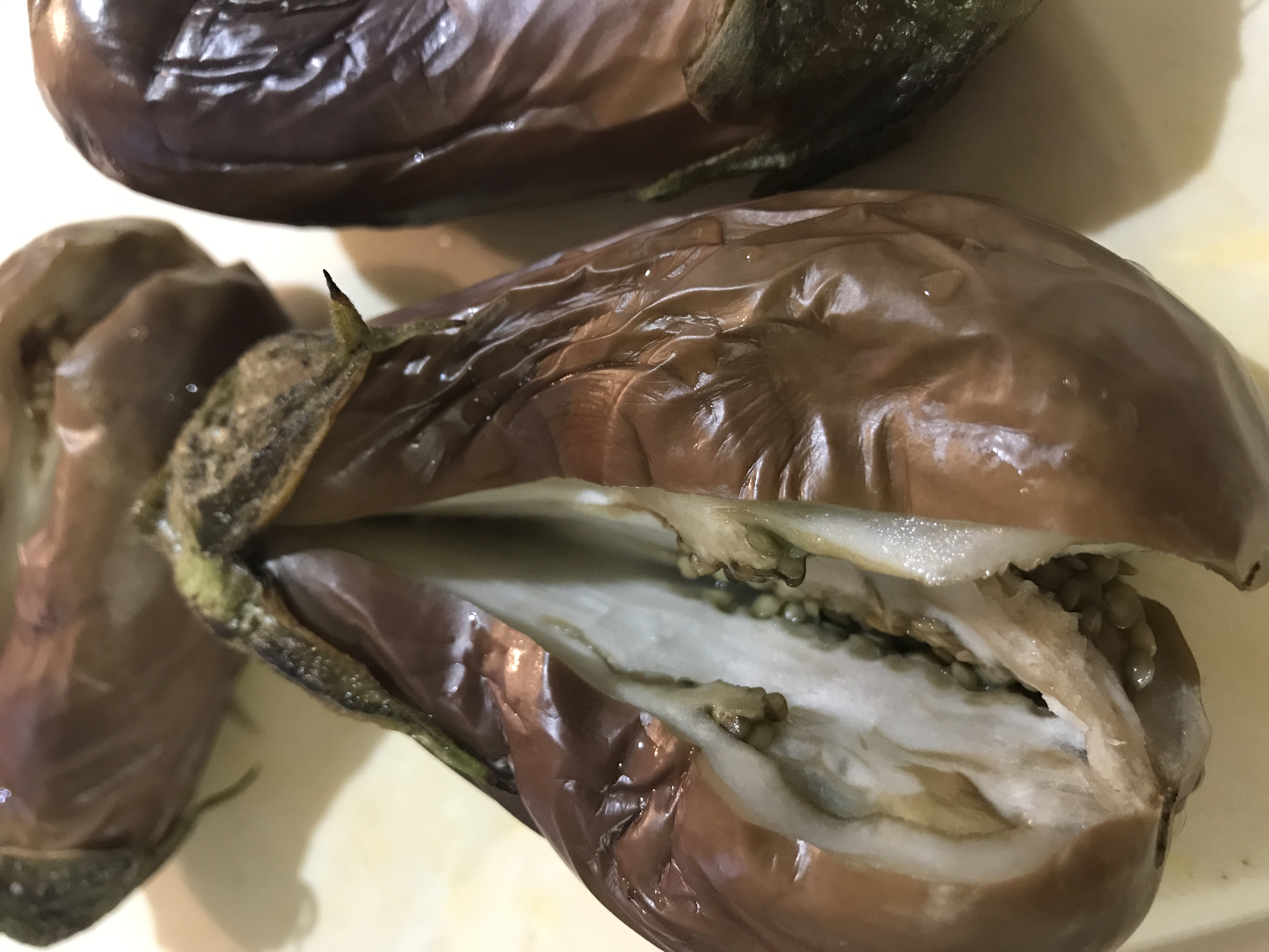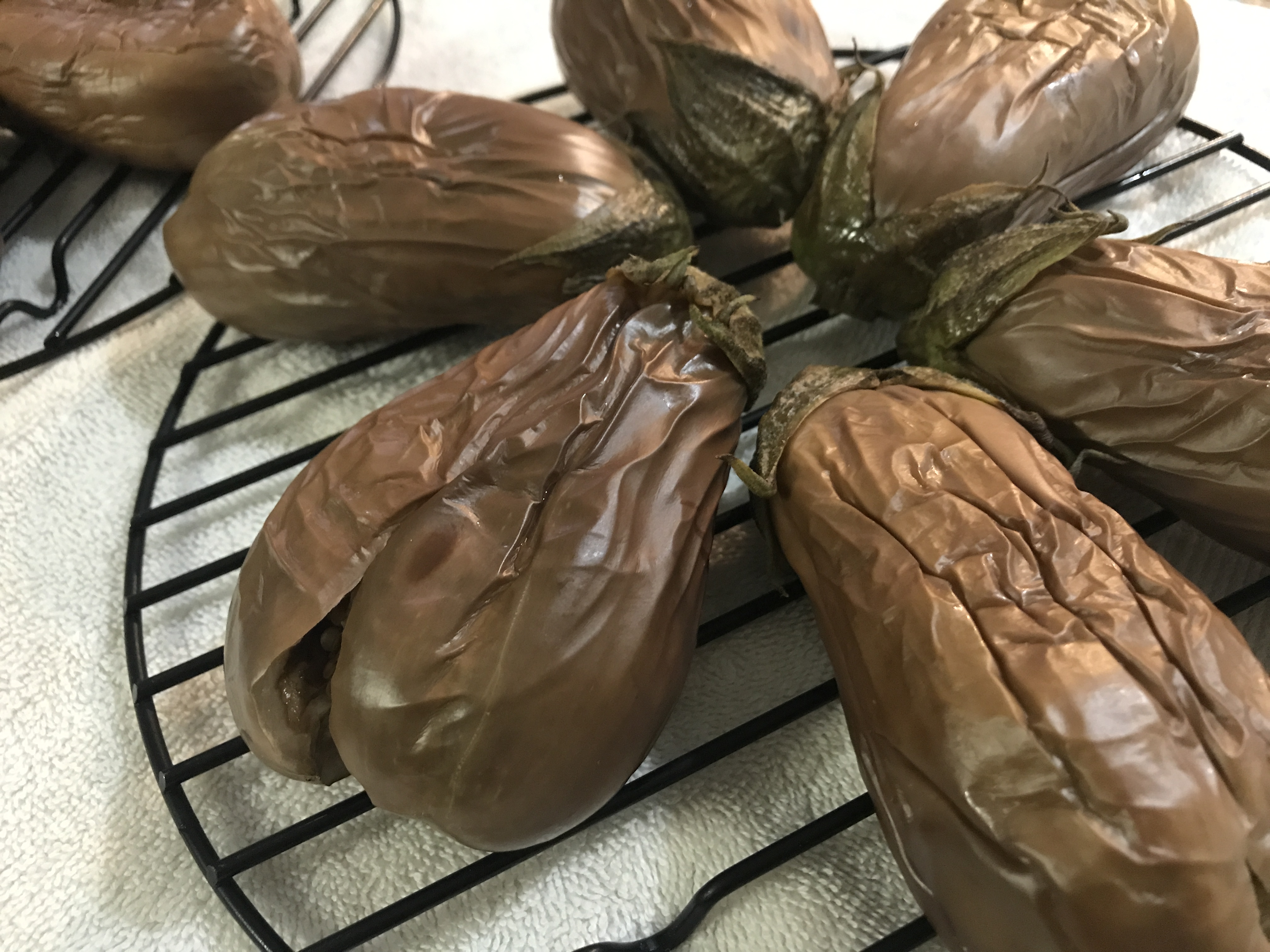 After 10 minutes, drain the eggplant. Once it is cool enough to handle, cut a slit in one side (not all the way through and try to leave about 1″ at each end uncut). Lay the eggplant on a rack, cut side down, and let drain overnight.