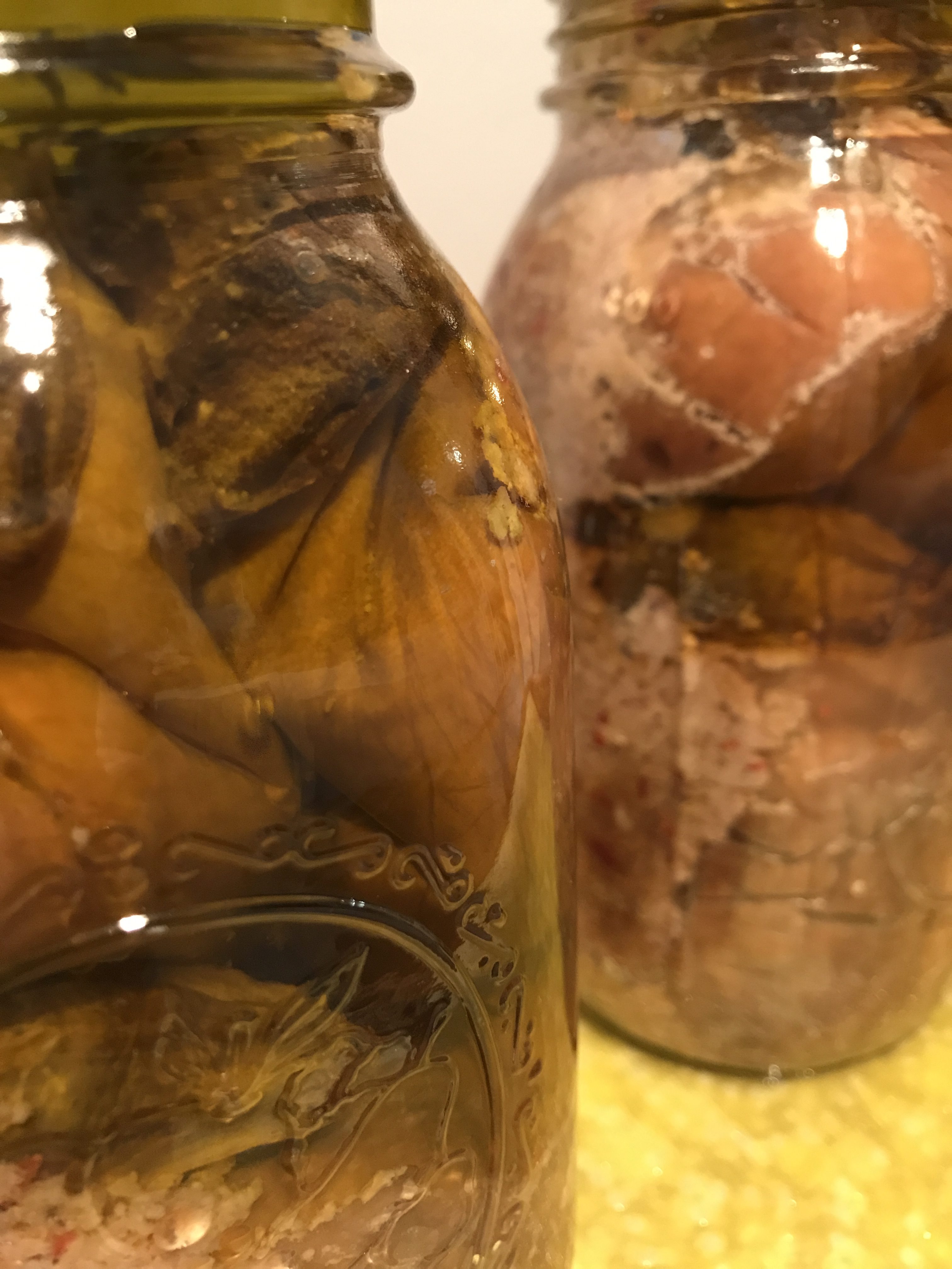 After 3 days. Notice how yellow the towels are. That’s the excess moisture and some olive oil escaping the jar. You may also see some bubbles. This is from the water and air escaping and it’s normal.