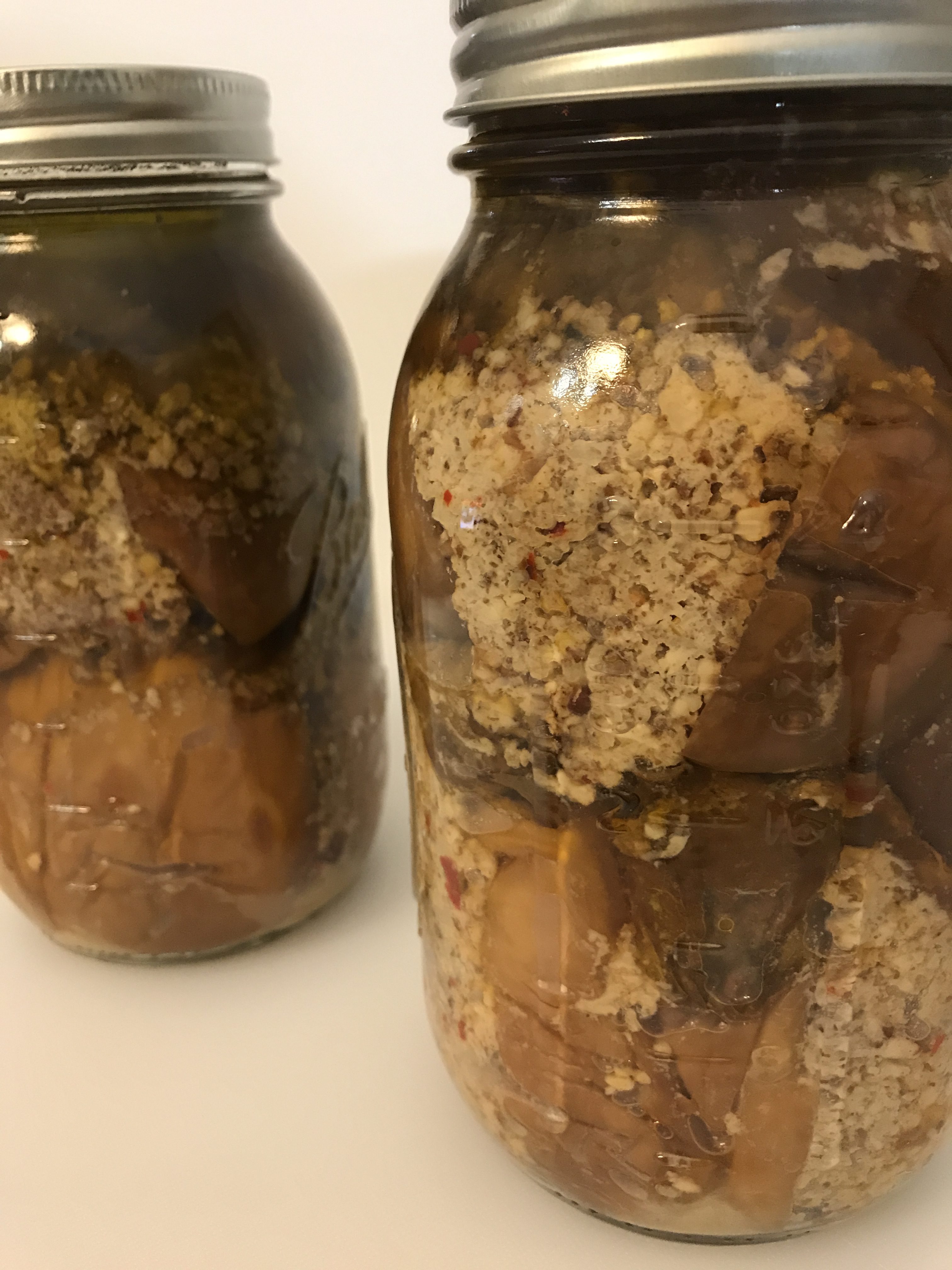 Place as many of the stuffed eggplant as you can in a Mason Jar with minimal crushing. Slowly add the olive oil to cover the eggplant. Set the jars on a rimmed baking sheet lined with a thick layer of paper towels or a dish towel you don’t really care about. Place the lid (only!) on the top of the jar. Place the baking sheet with the jars in a cool, dark place and let sit for 1 week.